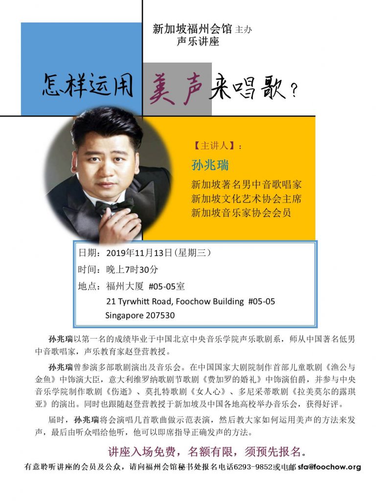 来临的11月13日(星期三)晚上7:30pm,福州会馆将在该大厦五楼的音乐室(#05-05室)主办一场声乐讲座,开放给福州会馆会员及所有对歌唱艺术有兴趣的公众。这次邀请到我国知名男中音孙兆瑞来给听众讲解《怎样运用美声来唱歌?》,主持为新加坡知名诗人音乐家郭永秀。