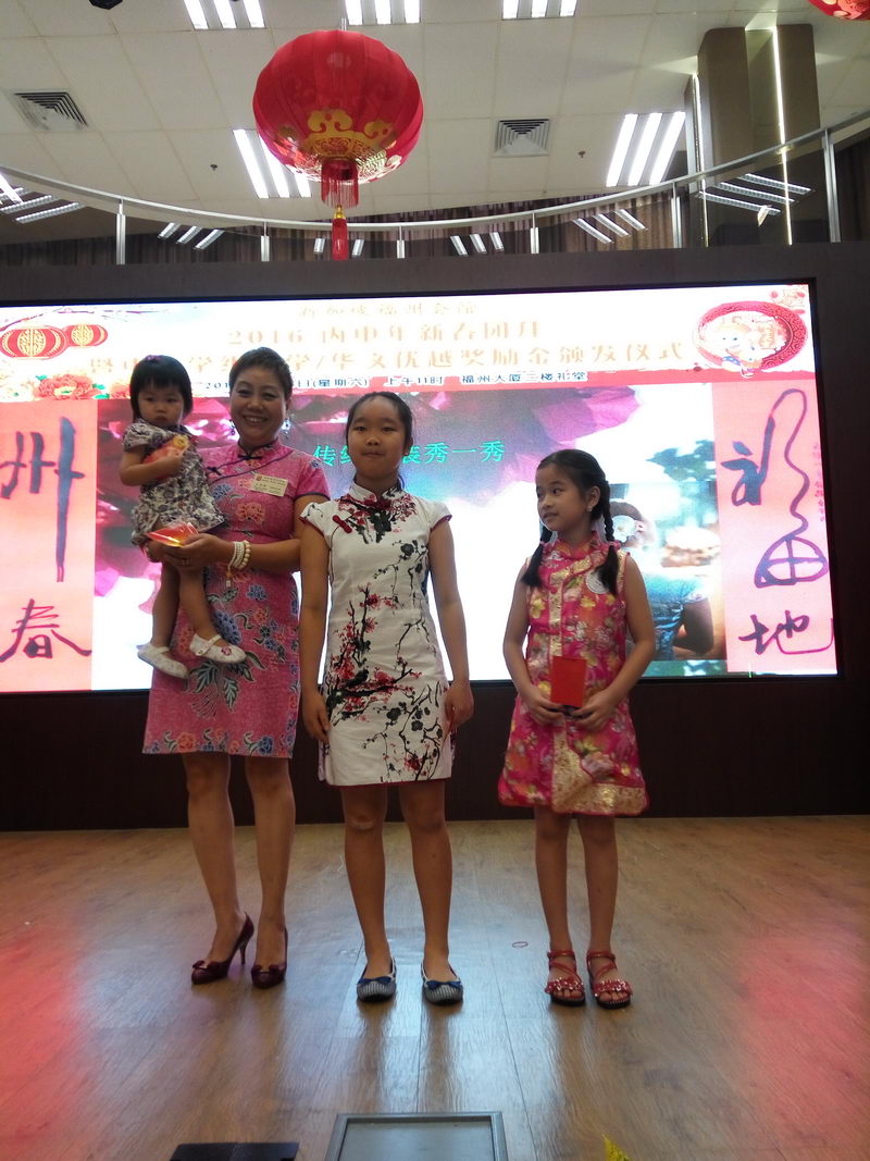 新春团拜上,来宾们纷纷穿着传统服装,成为一道亮丽的风景,特别是孩子们身上各式各样的传统服装既活泼可爱又衬托出热闹喜庆的新年气氛。为了鼓励这些孩子,理事王品华、程文涓给他们每人送上一个红包,还专门找出三位打扮最漂亮的孩子,请他们登上舞台,秀出自己的服装,送出一份更大的红包,以资鼓励。