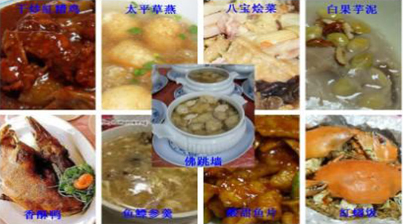 福州美食堪称中国八大名菜之一,其独特的风味,皆让人回味无穷。福州风情美食节自1992年起开始主办,广受好评,至今已是第十届了。为了让大家能品尝到正宗地道的福州菜,本届美食节筹委会特别从实兆远(小福州)的福州酒楼请来厨艺高超的大厨联合本地泉馨园餐馆呈献九道传统福州菜:佛跳墙、太平草燕、海参鱼鳔羹、酸甜鱼片、八宝烩菜、红蟳饭、干炒红糟鸡、香酥鸭、芋泥。