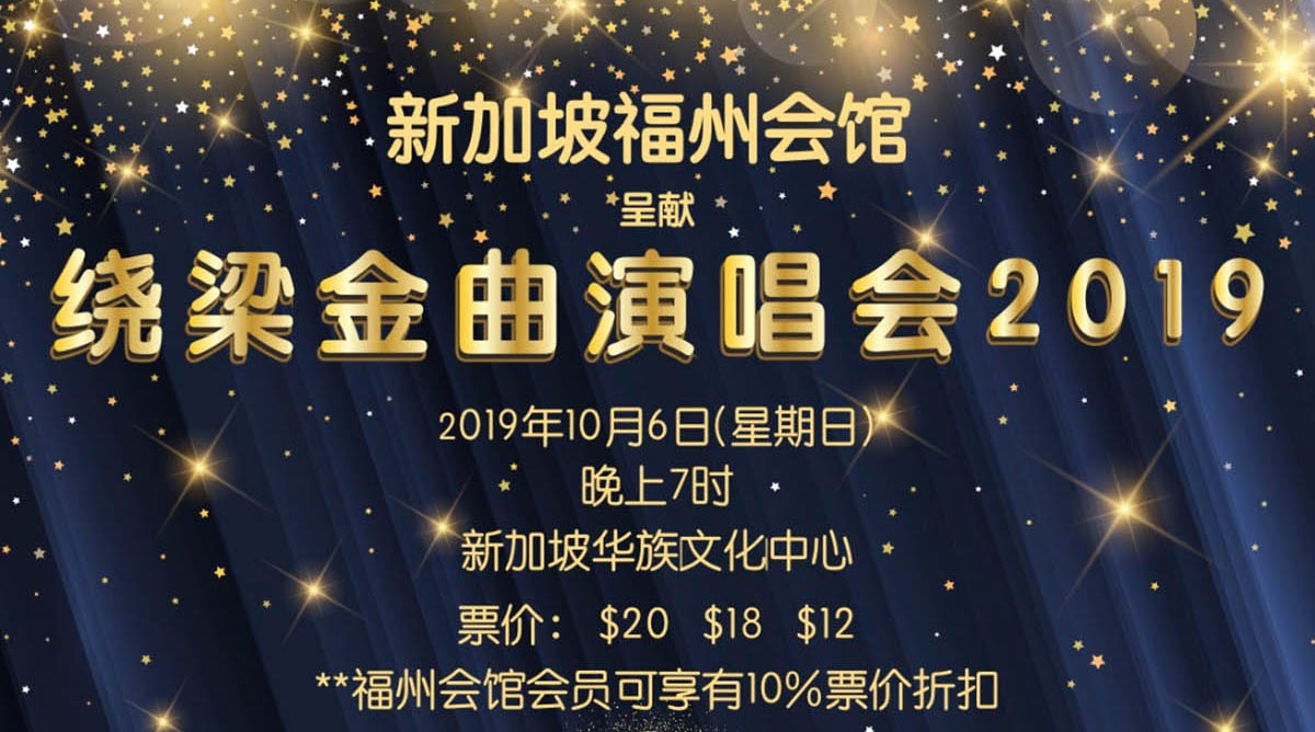 2019年10月6日,福州会馆的“绕梁金曲演唱会“将再次唱响,这次是在更大,更专业的舞台——新加坡华族文化中心——呈献这场已经延续了几年的经典老歌演唱会。