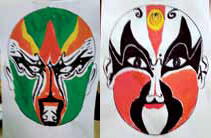 脸谱是指中国戏曲(尤其是京剧)演员脸上的化妆图案,因为这些图案均有特定的规格,所以被称为脸谱。出现在中国戏曲上的脸谱,不同的绘画方式、颜色、线条、表情,往往象征着戏曲内的角色灵魂和角色性格特质,例如忠奸善恶等等。因而大家都可以随着自己的意愿,把心目中的角色,透过自己的双手完全地呈现在脸谱上。而在开始绘画之前,老师在课堂上首先向大家讲解彩绘和上色的要诀,并提供样本让毫无头绪的学生参考。我们各自选择了自己喜欢的脸谱,有的选了红脸,有的选了绿脸,还有拿了蓝脸。接下来的任务就是画出脸谱的轮廓,然后涂上颜色。画图画涂颜色对我们来说并不陌生,但是画京剧脸谱、涂京剧脸谱的颜色却是第一次,每个脸谱上的眉、眼、鼻、口和细致的面部肌肉纹细,都让我们觉得新奇,一边画,一边就好像是我们自己粉墨登场,正在舞台上表演。大约四十分钟过后,同学们都涂好了自己的脸谱,每一张都有眉有眼,体现出了各自的特色。