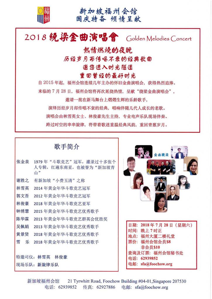自2015年起,福州会馆连续几年主办的怀旧金曲演唱会,获得热烈追捧。来临的7月28日,福州会馆将再次呈献“绕梁金曲演唱会”,邀请一批在新马舞台上熠熠生辉的乐龄歌手,演绎历经岁月却传唱不衰的老歌金曲。演唱会由林雪英和林俊豪联手主持,专业电声乐队现场伴奏。演唱会详情如下: